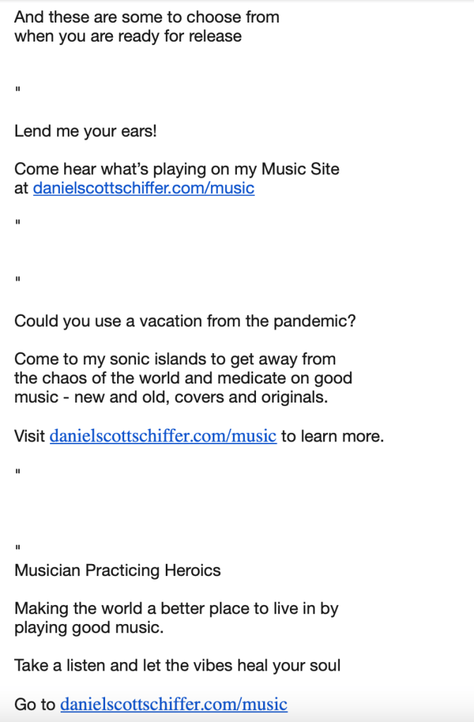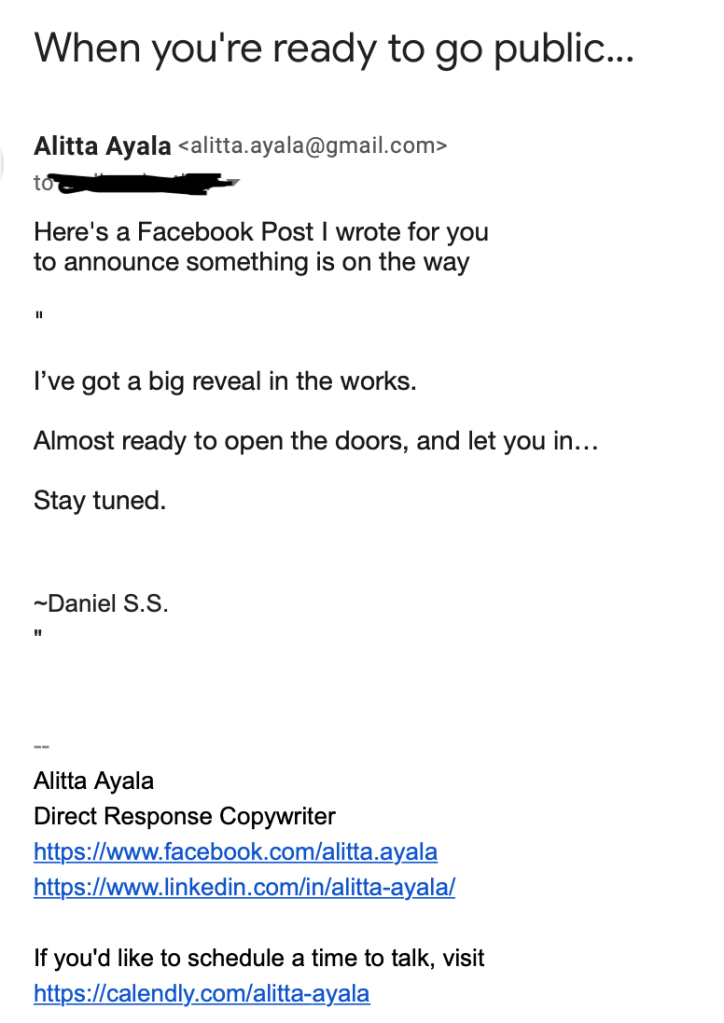 Here are the Facebook posts and ad I wrote. As well I wrote a stand alone email that invited his audience to take a first look at his new music website.