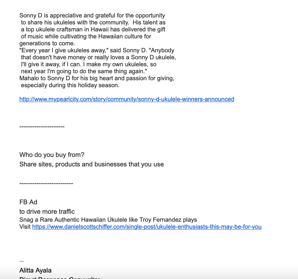 I would write emails, but he doesn’t have a list! So that might be my next project for him: List Building. Later I’ll work on Social Engagement, Driving Traffic and probably an E*Newsletter, too.