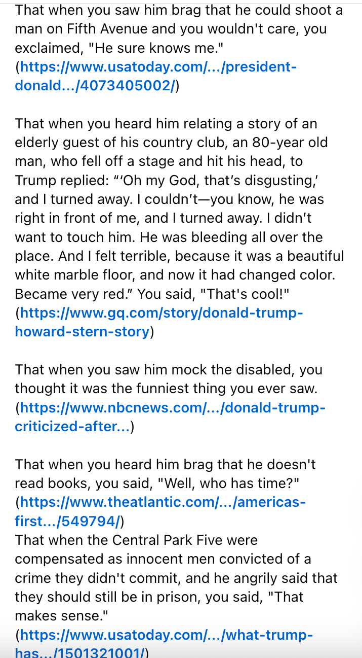Photo 2: Could shoot a man [without persecution]. Disgusted by an 80-year-old hitting his head on a beautiful white marble and changing it red. Mock the disabled. Brags he doesn’t read books. Accused wrongfully convicted Central Park Five of guilt.