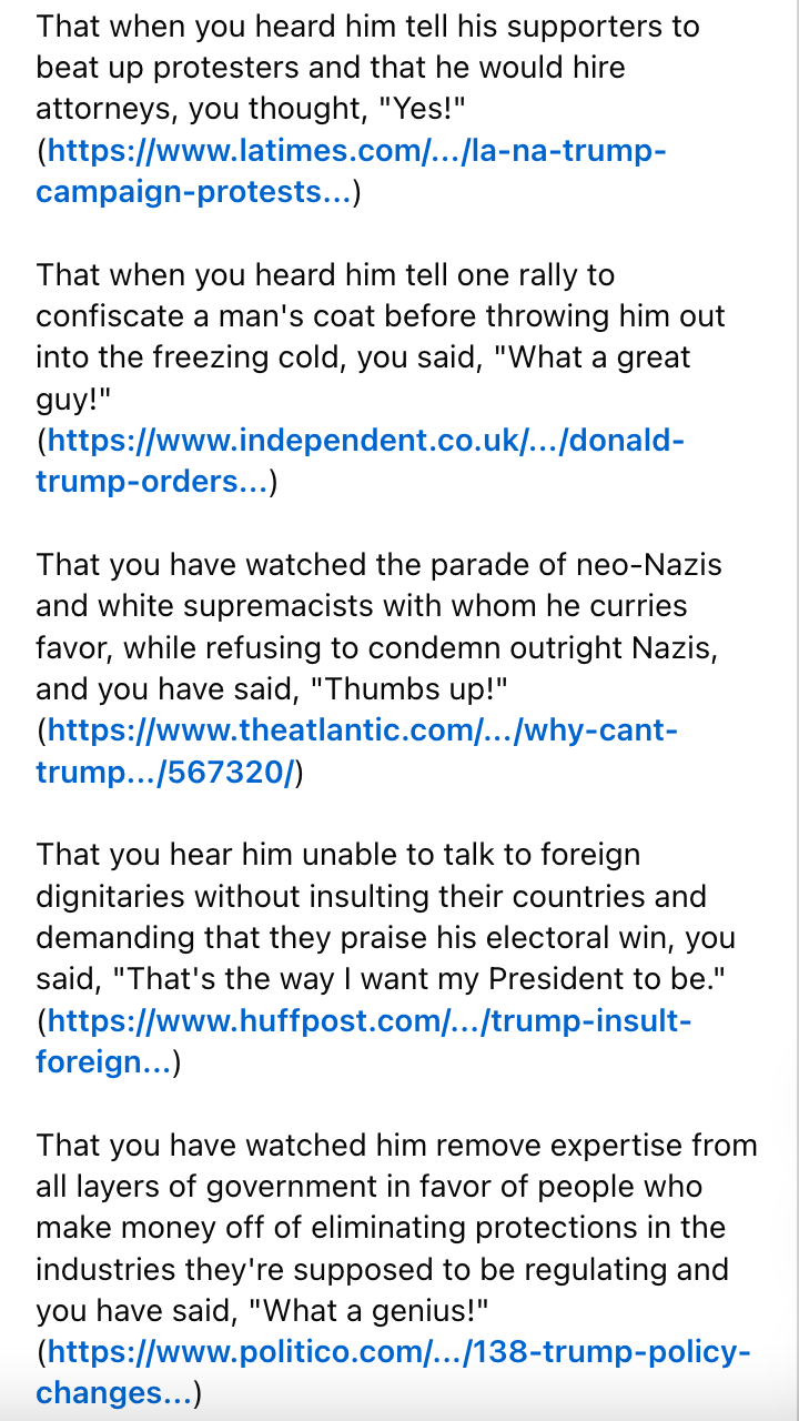 Photo 3: Endorsement of violence. Confiscate his coat before throwing him out in the freezing cold. Refuses to condemn Nazis. Insults foreign dignitaries. Removes regulating experts to favor those who make money off eliminated protections.