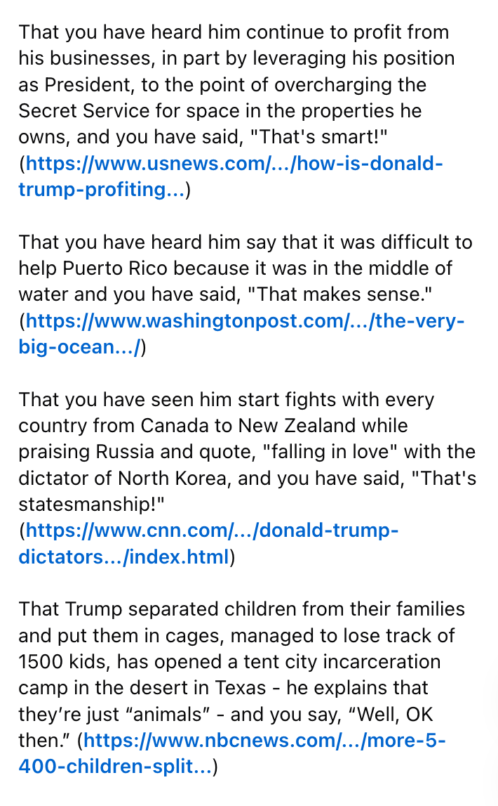 Photo 4: Rakes in profit as President [of United States]. Blamed the ocean as excuse not to help Puerto Rico [hopefully they’re voting even more now. PR still hasn’t fully recovered]. Falling in love with dictators. Put children in cages.