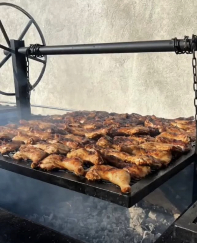 Fresh BBQ chicken or ribs are served up by Flamas BBQ, ready to eat with sides of salad, bread, and sauce at the open air market in Los Angeles.